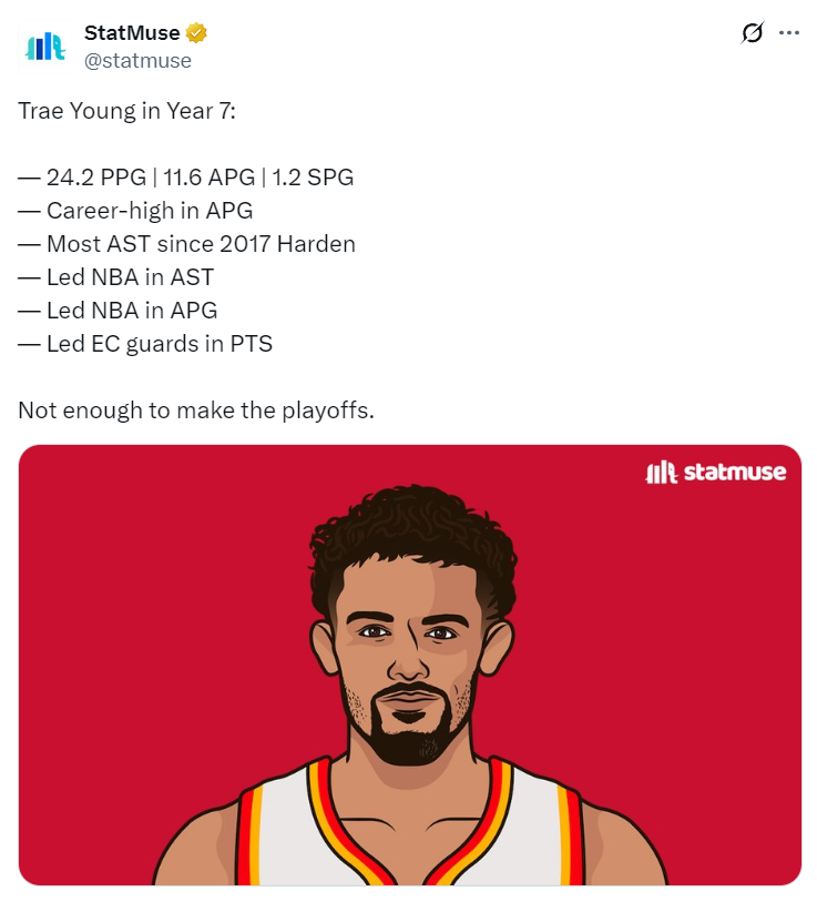 特雷杨生涯第七个赛季,场均24.2分11.6助攻1.2抢断,助攻生涯新高荣获本赛季的助攻王,场均11.6次助攻是17年哈登后最高,只可惜老鹰最终还是未能打入季后赛。