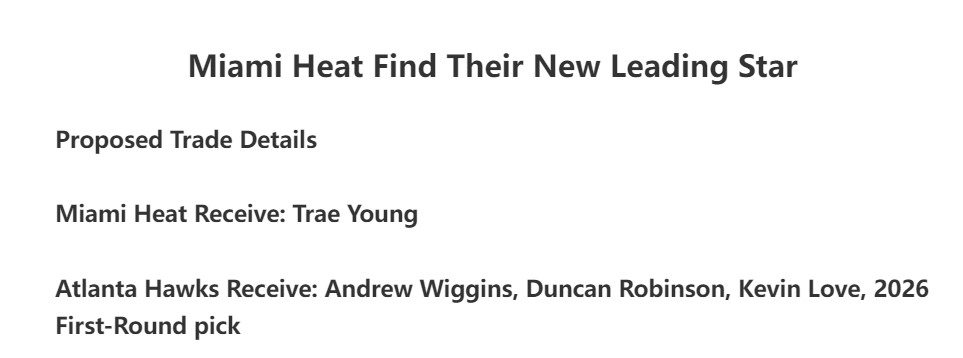 热火换特雷杨的筹码:安德鲁-威金斯、邓罗、乐福、2026年首轮签,也就是4换1。