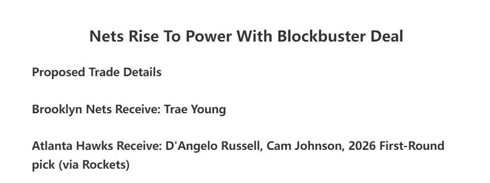 篮网换特雷杨的方案,篮网送出拉塞尔、卡梅伦-约翰逊、2026年首轮签(来自火箭),也就是3换1。